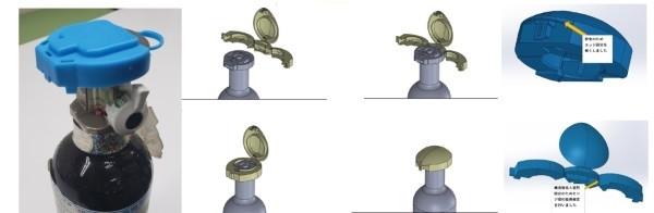 小型医療用酸素ボンベアタッチメント部の保護と開封確認(使用済み確認)を満たし、更に不正使用防止対策を兼ね備えた安全キャップの開発。